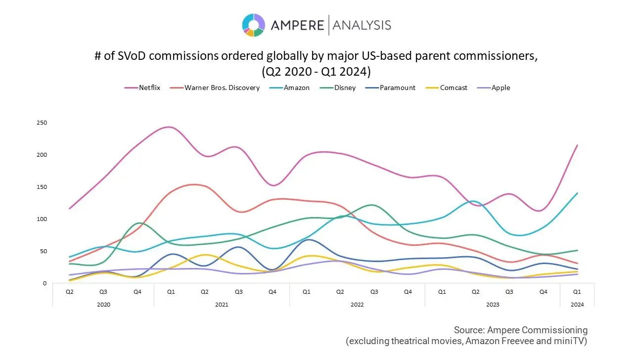 In Q1, 2024, Netflix and Amazon saw a big uptick in their commissions, and are now 53% of all global commissions as reported by Ampere Analysis. So while these two SVOD players have seen a resurgence in their commissions, it is also a real comment on the decline in SVOD commissioning particularly by WBD and to a lesser extent Disney+.
