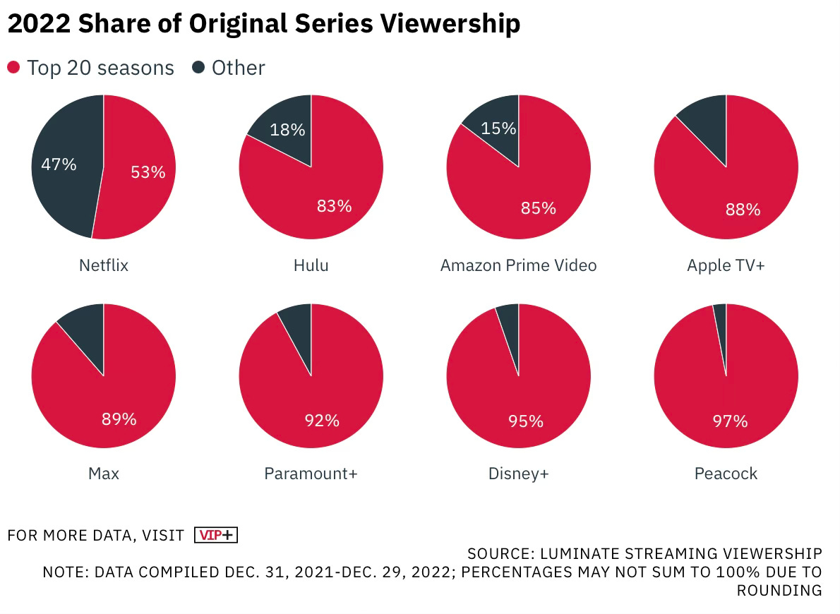 A follow up to Variety VIP+’s report into the death of peak TV demonstrates how streamers (Netflix aside) overspent on original content. “… on all of the major U.S.-based SVOD services except Netflix, the top 20 most-watched TV seasons in 2022 accounted for more than 80% of original series viewing hours.”